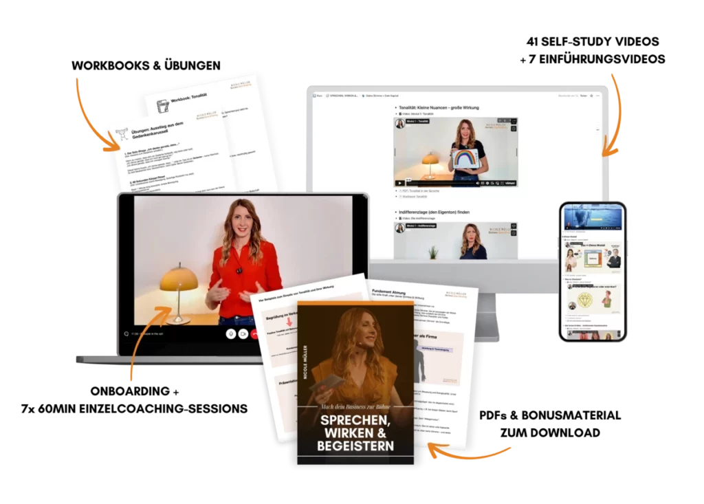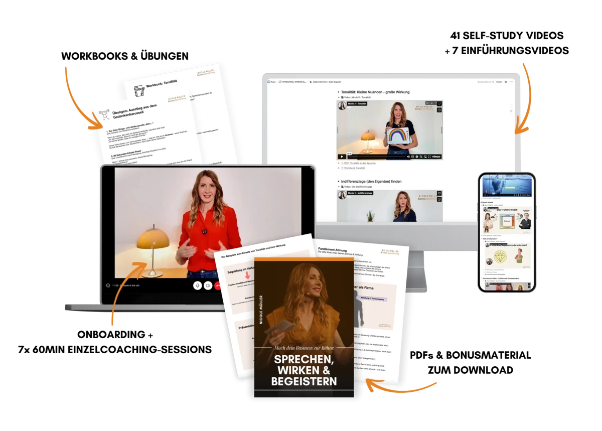 In 7 x 60 Minuten 1:1 Online-Sessions arbeiten wir beispielsweise an Rhetorik, Stimme, Körpersprache, Mindset und Gesprächsführung. Zusätzlich erhältst du Material und Workbooks zum eigenständigen Lernen.